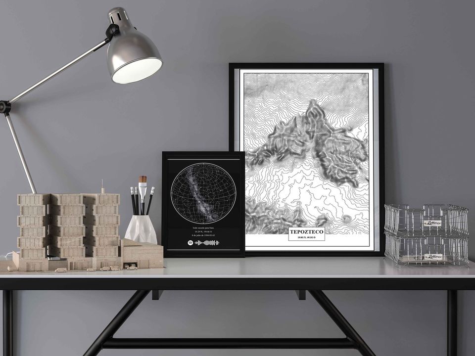 El mapa topográfico representa el relieve de algún lugar importante para ti, tu primera ruta en moto, esa montaña que te identifica, algún viaje increíble, etc. puedes hacerlo interactivo con música de spotify o agregar una fotografía del momento.
